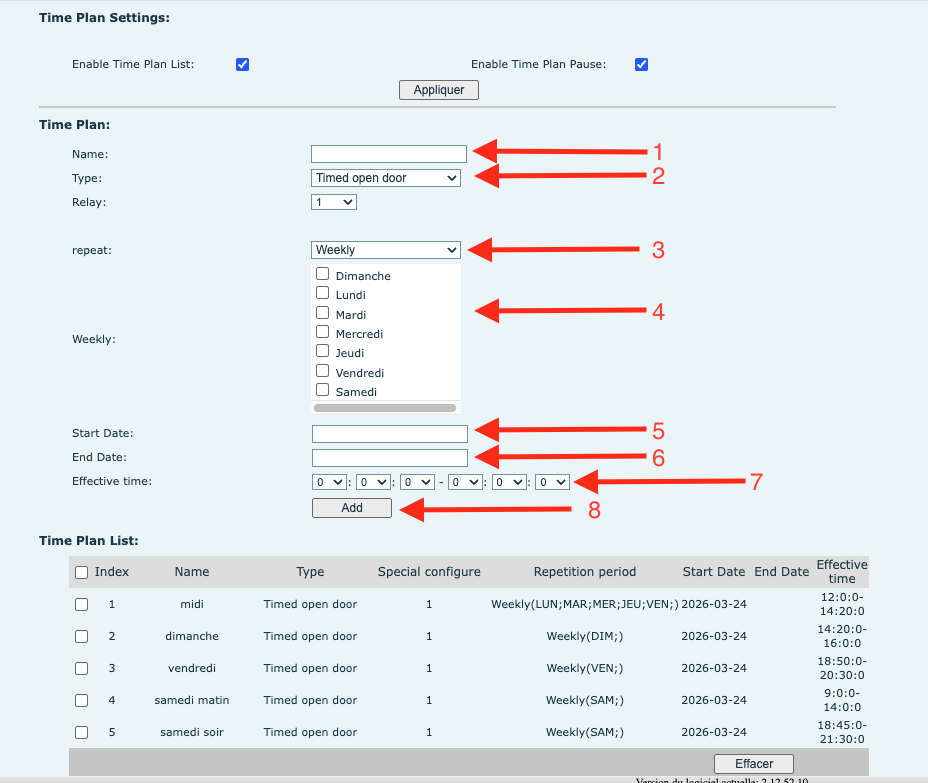 Dans cet écran, vous pouvez créer une période d’ouverture automatique de porte. Chaque champ a un rôle précis.